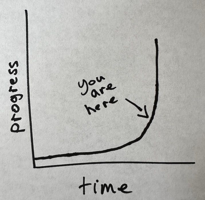 Recently though, progress has been hard to ignore. It seems like every other day there's some new paper or breakthrough. This is because our rate of progress is starting to go vertical. We've gone from one side of the curve to the other. Eventually we'll be fully vertical (aka the Singularity), which I think will happen in our lifetimes - perhaps even this decade.